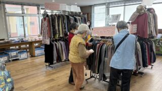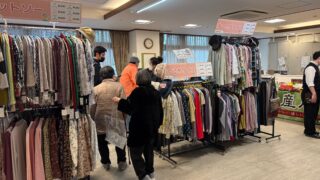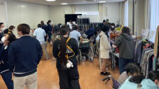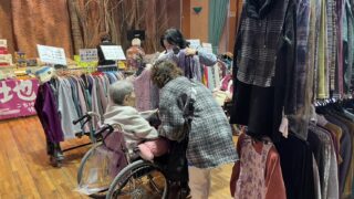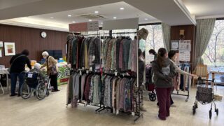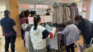 こちらの施設様では定期的に開催させていただいております。食堂をお借りし、衣類や食品を並べさせていただきました。いつも楽しみにしてくださる方がおり、こちらもとても嬉しく思っています。また暖かくなったころに開催させていただきます。